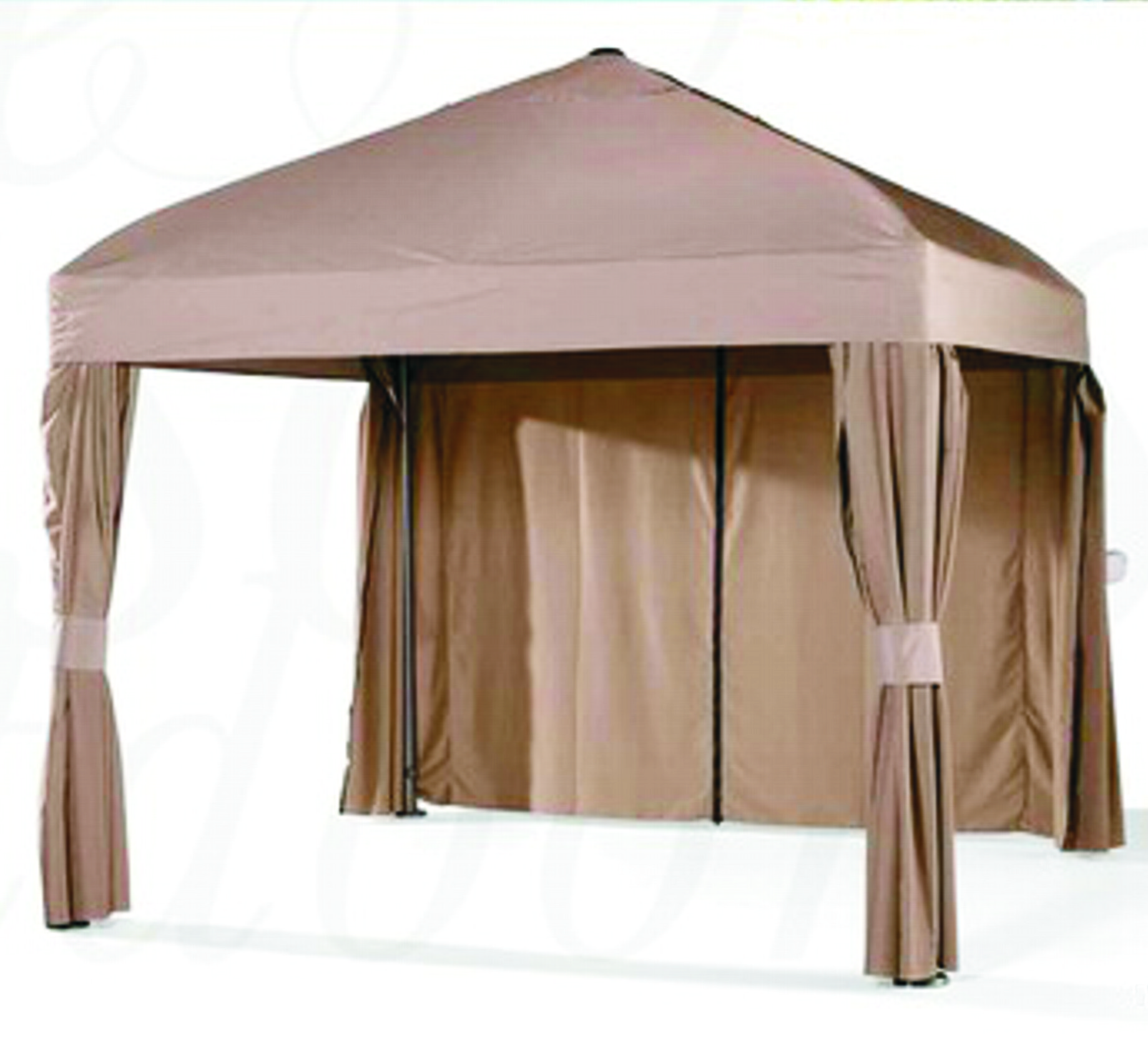 STRUTTURA IN ALLUMINIO VERNICIATO A POLVERE EPOSSIDICA DI COLORE MARRONE, 4 PALI VERTICALI CON SEZIONE OVALE DIAM. 80MM, TELO IN POLIESTERE CON RIVESTIMENTO IN PVC 250G/M2 IDROREPELLENTE DI COLORE ECRÙ, SOFFIETTO ANTIVENTO CON PILASTRINO PORTA LANTERNA, PENDENTE FINITURA RIQUADRO, TENDE LATERALI IN POLIESTERE 160G/M2.