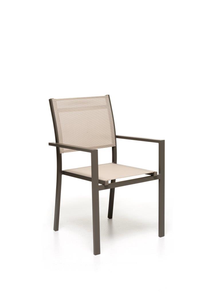 STRUTTURA IN ALLUMINIO VERNICIATO DI COLORE BROWN, SEDUTA E SCHIENALE IN TEXTILENE DI COLORE TORTORA.