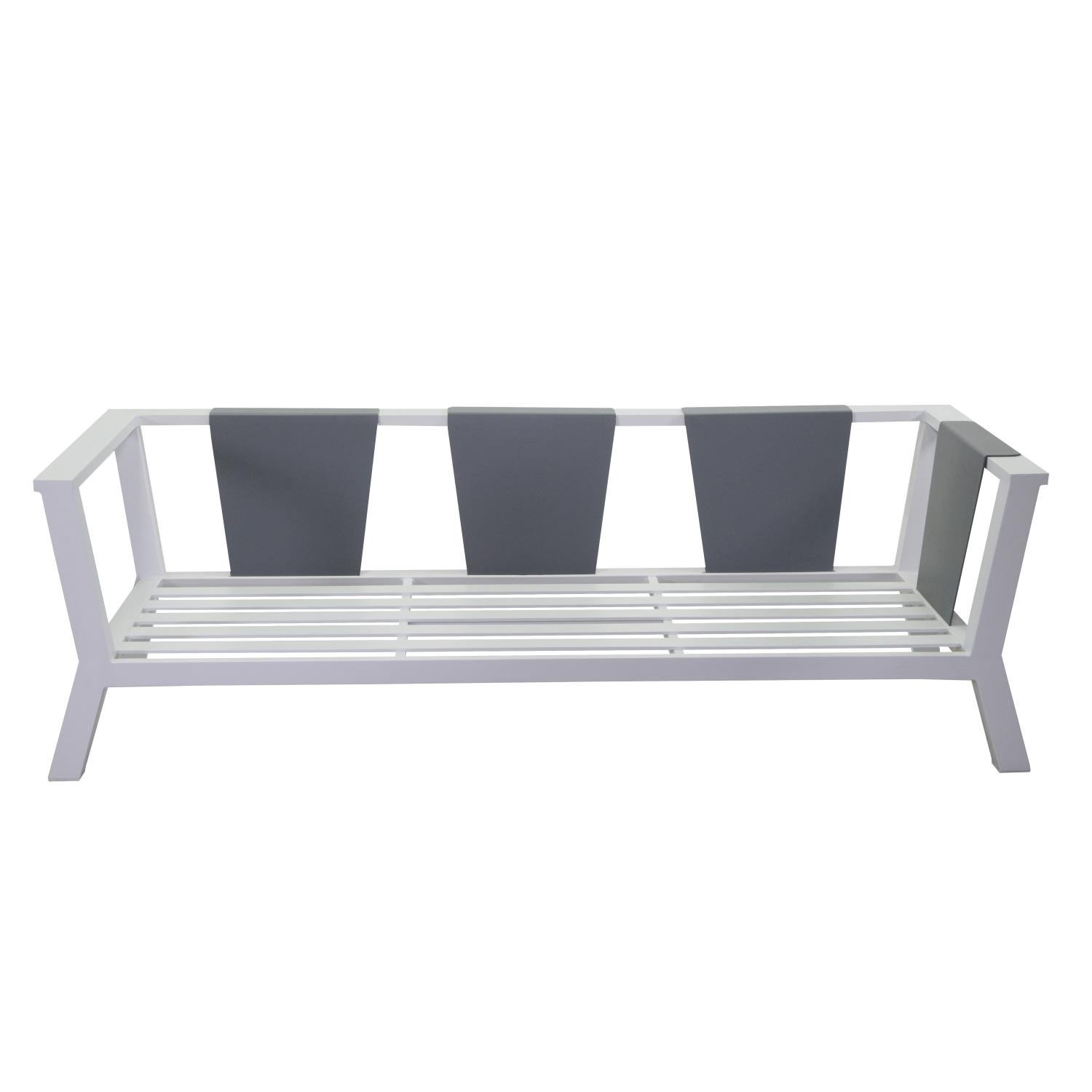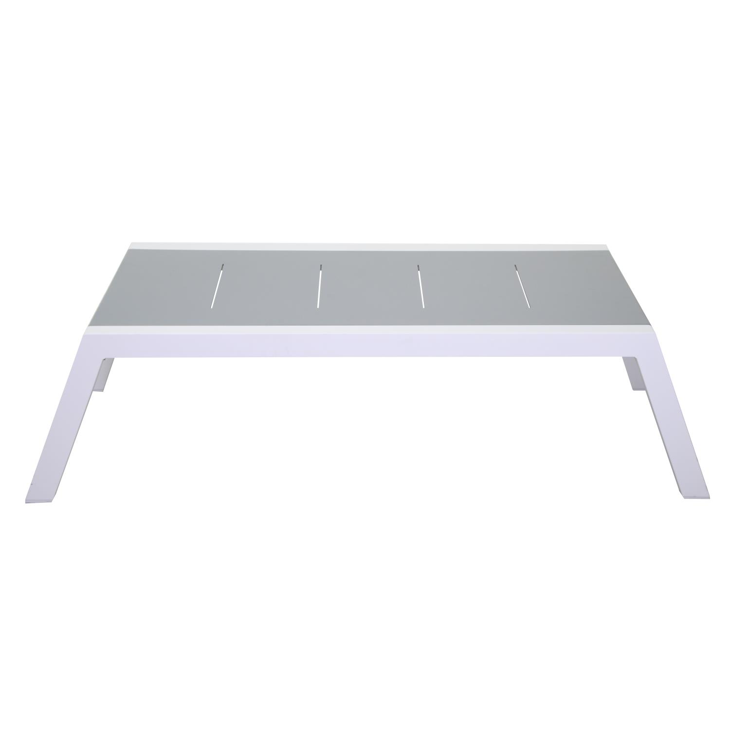Struttura in alluminio con verniciatura a polvere colore bianco Cuscino seduta e schienaledi tessuto color grigio chiaro Cuscini sfoderabili 100% poliestere impermeabile Piano tavolo di alluminio